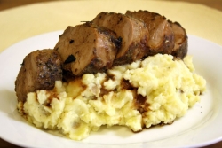 - To serve: Spoon mashed potatoes onto a large serving platter. Arrange pork slices over potatoes; pour pan sauce over the whole thing. Enjoy.